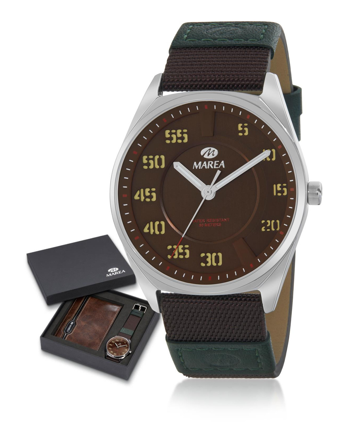 Este reloj viene presentado en estuche con billetera color marrón