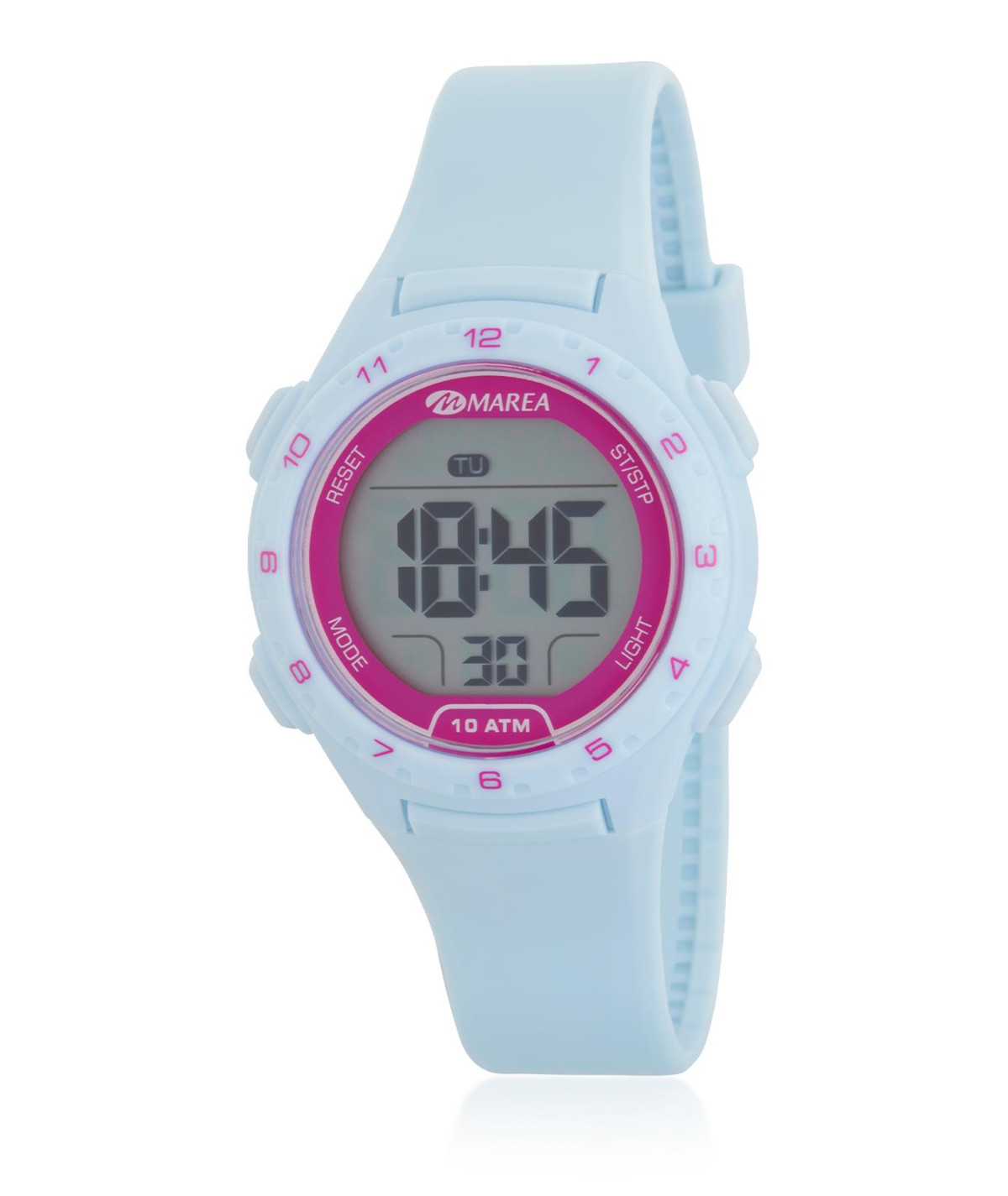 Reloj infantil con caja de resina color azul claro con detalles en color fucsia