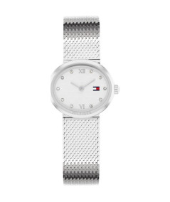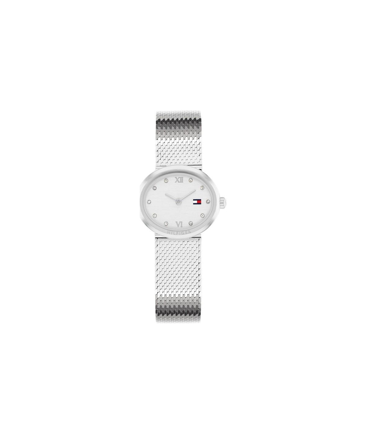 Reloj para mujer, analógico con caja ovalada de acero color plata y esfera blanca