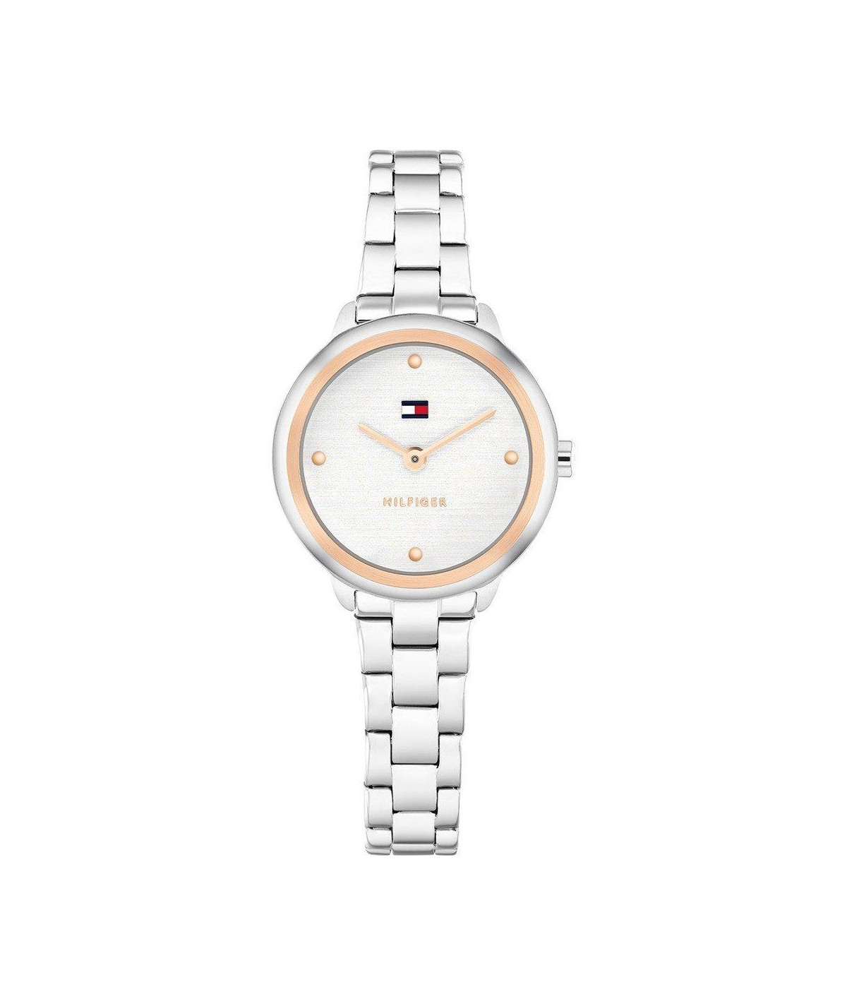 Reloj para mujer, analógico con caja de acero color plata y esfera plateda con índices y agujas en tono rosé gold